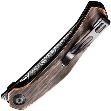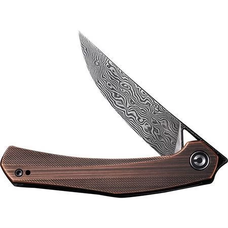 Model – CIVC20013DS1. Civivi 20013DS1 – Lazar Linerlock Copper. 4.25″ (10.8cm) closed. 3.25″ (8.26cm) Damascus steel blade. Hand rubbed copper handle. Extended tang. Pocket clip. Thumb pull. Black nylon zippered storage case. Boxed. Made in China.