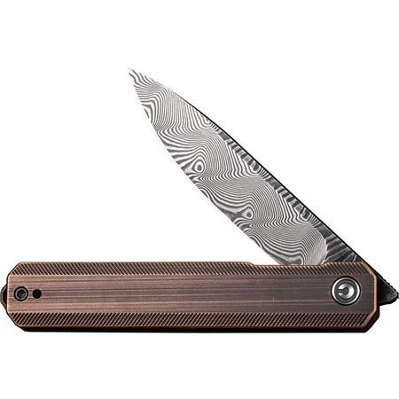 Model – CIVC2003DS2. Civivi 2003DS2 – Exarch Linerlock Damascus. 4″ (10.16cm) closed. 3.25″ (8.26cm) Damascus steel blade. Hand rubbed copper handle. Pocket clip. Lanyard hole. Black nylon zippered storage case. Boxed. Made in China.