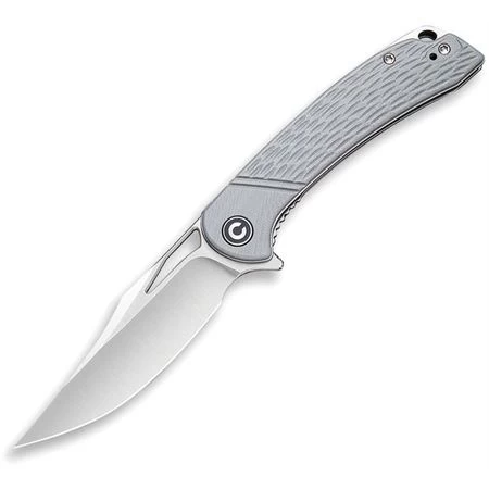 Model – CIVC2005B. Civivi 2005B – Dogma Knife Gray. 4.25″ (10.8cm) closed. 3.5″ (8.89cm) satin finish D2 tool steel clip point blade. Gray G10 handle. Extended tang. Lanyard hole. Pocket clip. Black nylon zippered storage case. Boxed. Made in China.