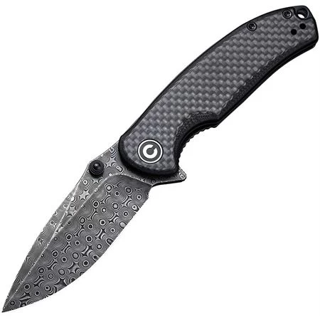 Model – CIVC2020DS1. Civivi 2020DS1 – Pintail Knife Black. 4″ (10.16cm) closed. 3″ (7.62cm) Damascus steel blade. Black G10 handle with carbon fiber overlay. Extended tang. Lanyard hole. Thumb stud. Pocket clip. Black hand-rubbed finish blade. Black nylon zippered storage case. Boxed. Made in China.