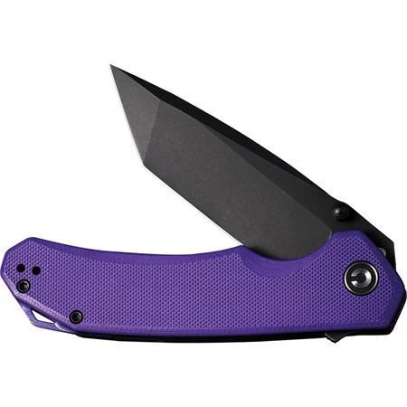 Model – CIVC2023D. Civivi 2023D – Brazen Knife Purple. 4.5″ (11.43cm) closed. 3.5″ (8.89cm) black stonewash finish D2 tool steel tanto blade. Purple G10 handle. Thumb stud. Extended tang. Lanyard hole. Pocket clip. Black nylon zippered storage case. Boxed. Made in China.