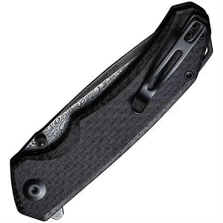Model – CIVC2023DS1. Civivi Brazen Linerlock Damascus. 4.5″ (11.43cm) closed. 3.5″ (8.89cm) Damascus steel tanto blade. Black micarta handle. Extended tang. Thumb stud. Lanyard hole. Pocket clip. Black nylon zippered storage case. Boxed. Made in China.