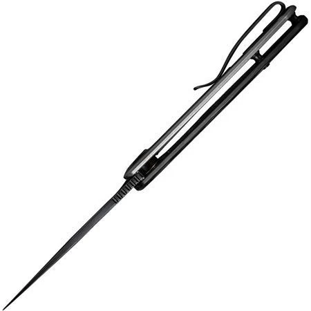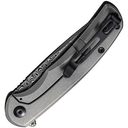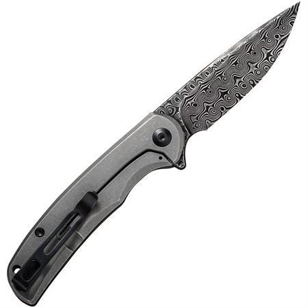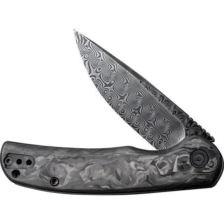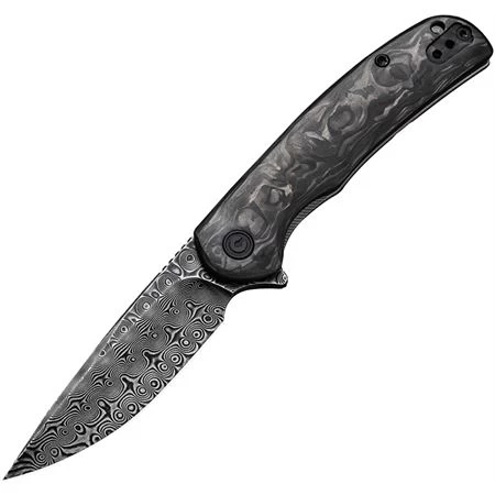 Model – CIVC2110DS1. Civivi NOx Framelock CF. 4″ (10.16cm) closed. 3″ (7.62cm) Damascus steel blade. Carbon fiber handle with titanium back handle. Extended tang. Pocket clip. Black nylon zippered storage case. Boxed. Made in China.
