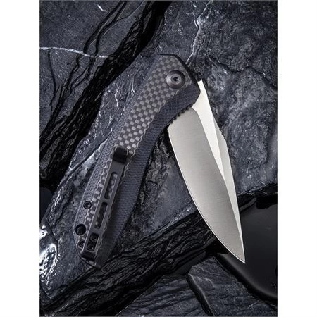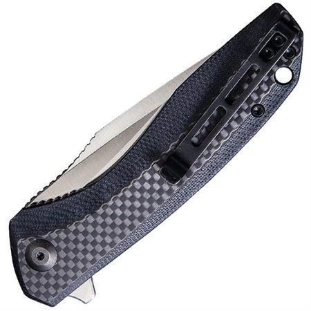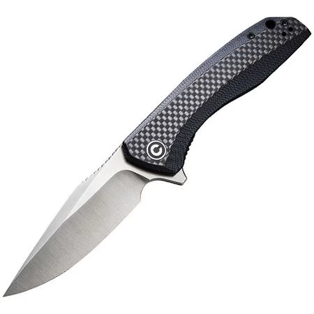 Model – CIVC801D. Civivi 801D – Baklash Knife. 4.63″ closed. 3.5″ satin finish 9Cr18MoV stainless blade. Black G10 handle with carbon fiber onlay. Extended tang. Lanyard hole. Pocket clip. Black nylon zippered storage case. Boxed. Made in China.