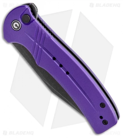 - Lightweight G-10 handle in purple with steel liners.