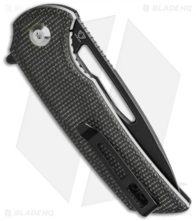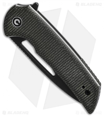 - Textured and contoured dark green micarta handle scales.