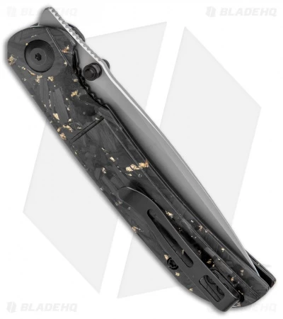 - Gold accented, shredded carbon fiber handle with a resin coat and black hardware.