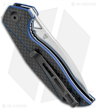 This model of the CIVIVI Anthropos comes with a satin finished D2 steel blade. The handle is comprised of deep blue G-10 with a carbon fiber overlay.